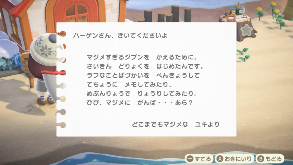ログインしたら、住人のユキさんから手紙が届いておりました。